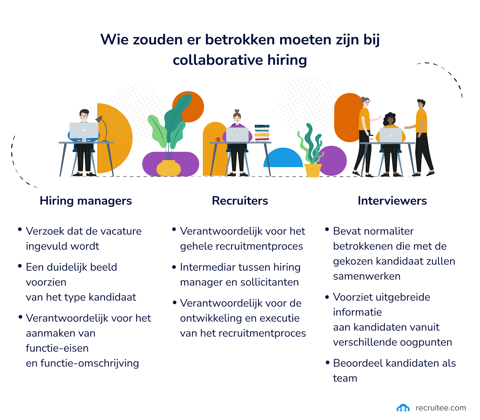 Collaborative hiring haalt druk weg bij de recruiter. Meer teamgenoten zijn betrokken in het proces, waardoor de recruiters niet uitsluitend verantwoordelijk zijn voor iedere fase van het recruitmentproces. Hierdoor kan de recruiter strategischer te werk gaan in een coördinerende rol.