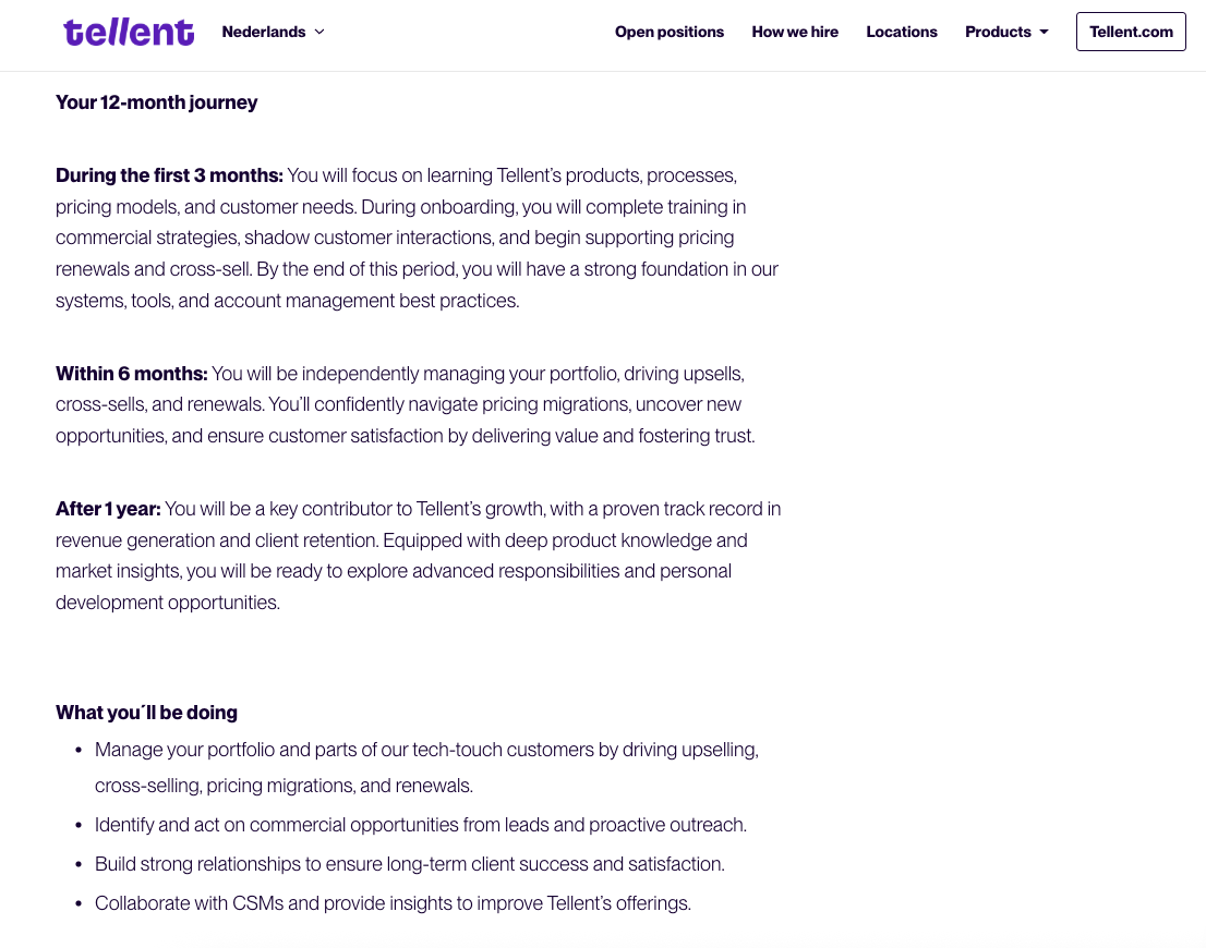 Deze roadmap laat zien wat nieuwe medewerkers kunnen verwachten in de eerste 3 maanden, 6 maanden en na een jaar. Zo krijgen zij meteen een realistisch beeld van hoe de rol zich ontwikkelt.